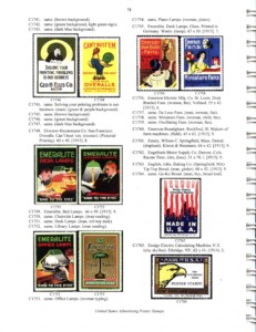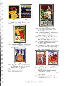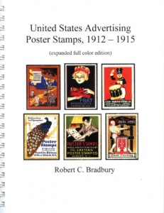 The Bradbury book (most recent edition January 2018) is the opposite, concentrating on only advertising stamps from 1912-1915, indexed by the company name of the advertiser. There are over 6400 entries, with over 2300 illustrated in color. There are numerous reference citations and appendices listing various “stock” design sets, and the imprints known on them.