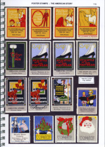The 2 books mentioned combine to give a good dose of golden era poster stamps of the US in particular. The Kiddle book is a summary sampler of poster stamps of the US; not numbered or arranged as a catalog, also including some covers and pages from albums and brochures of the time. The era covered includes some from the late 1800’s through to World War 2. There is a table of contents, but no index. All in color.